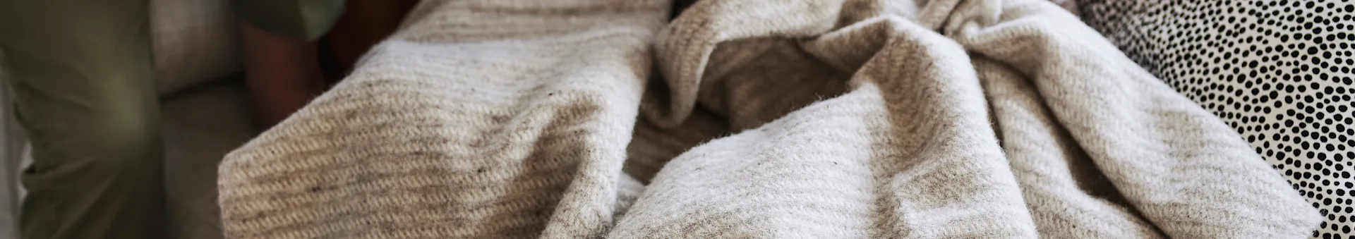 Wool is a naturally dirt repellent material, it is often sufficient to hang your Klippan Yllefabrik throw or blanket up to air. This is especially effective when it is a bit humid outside, but make sure avoid direct sunlight as it can the colours can fade.