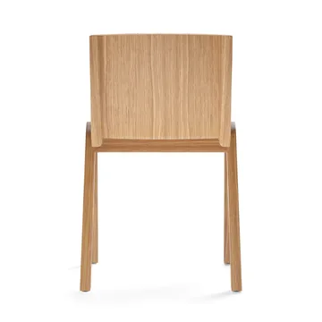 Ready chair from Audo Copenhagen is the result of a study of form pressing techniques, created by Matias Møllenbach and Nick Rasmussen. Inspired by classic cantilever chairs, it features a floating seat and backrest. Available in oak veneer with a natural or red-dyed oak finish and optionally upholstered seat and back. Perfect for the dining room, its stackable design and row linking feature make it versatile for various uses.