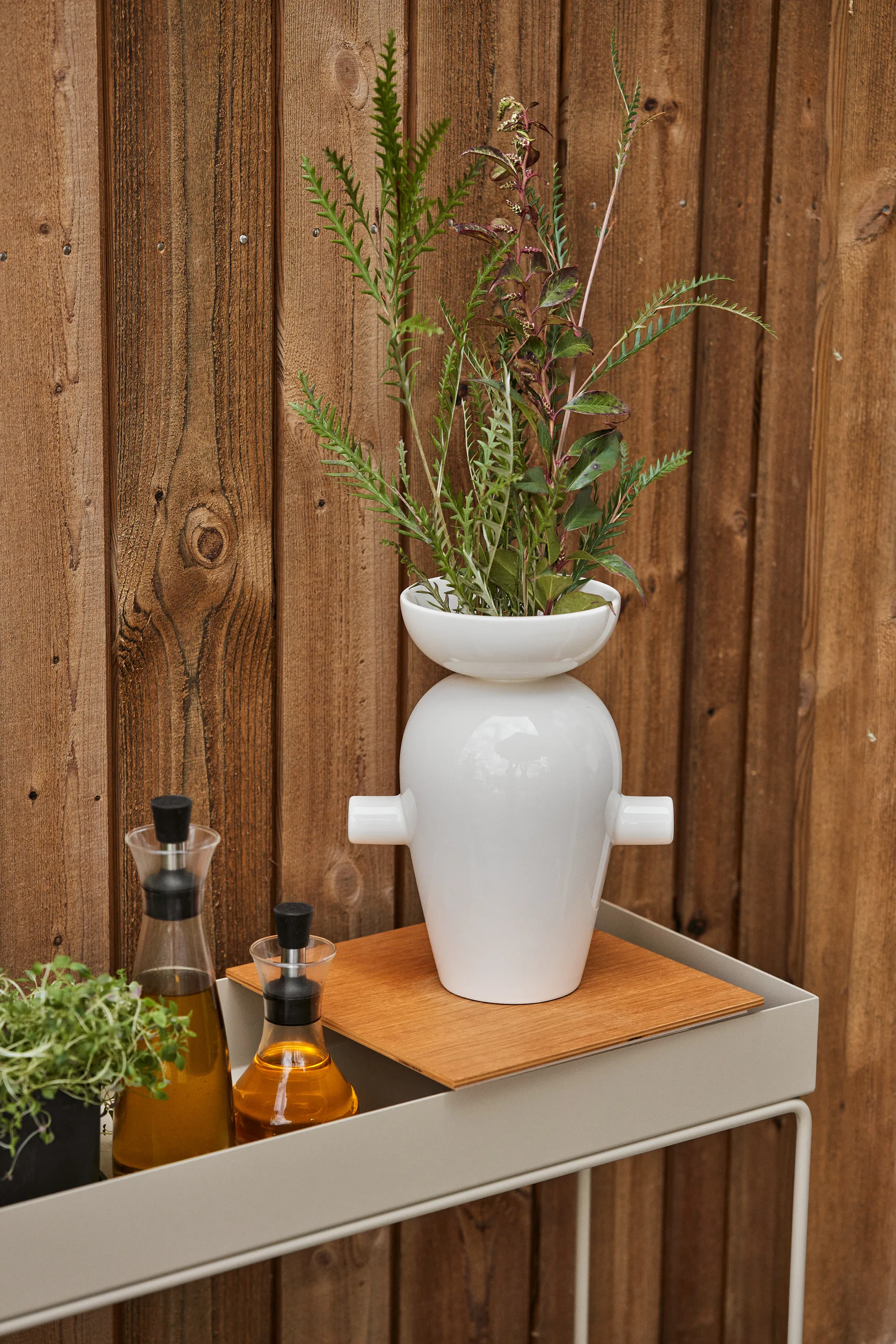 This console table takes the immensely popular Ferm Living plant box to a whole new level. The table bears the same stylish yet minimalist lines that adorn the plant box, here arranged in a taller and higher profile. A flush shelf sits at the bottom while a tray with raised edges is mounted on top. Use the lower shelf to create a gorgeous display with high vases or other large decorations. The upper tray is perfect for smaller decor such as potted plants or an arrangement of books and trinkets to create a striking still life. The console table can also be used outside, making it ideal for housing plants and greenery on the terrace or balcony.