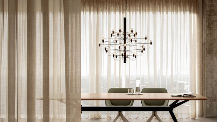 Among Flos’s most celebrated designs is the 2097 chandelier by Gino Sarfatti. First introduced in 1958, its industrial structure and soft, atmospheric glow have made it a modern classic — available today in elegant finishes such as chrome and brass.