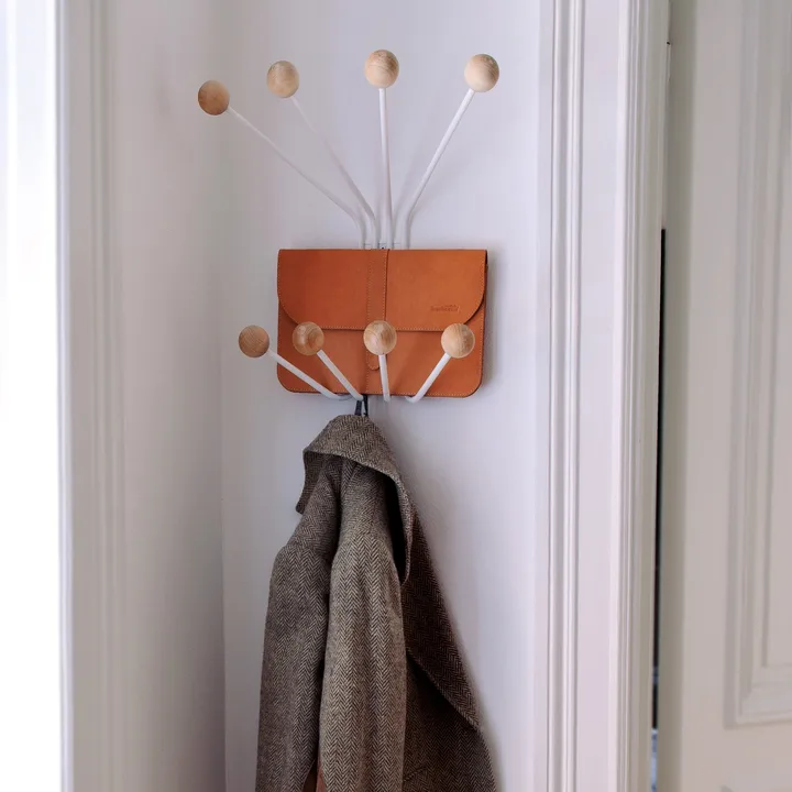 Bill is a modern hanger in classic style for the hall. Made in white lacquered metal and eight wooden knobs.