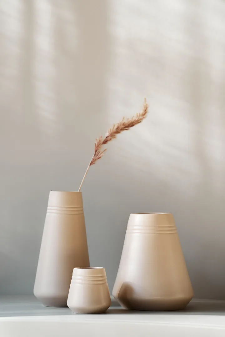 Lines vase 8 cm from NJRD is a charming porcelain vase from the Lines series, designed by Bernadotte & Kylberg. The three indented lines at the top create a calm, graphic expression recognizable from the collection and highlight both floral arrangements and single sprigs. Thanks to its thoughtful shape, the vase works just as well as a subtle decorative detail on a shelf as it does in a beautiful bouquet on the table — easy to place wherever the home needs a soft, artistic touch.