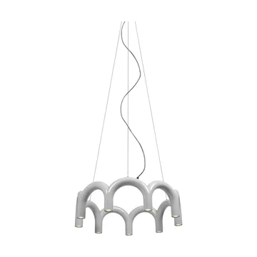 Arch circle pendant Ø76 cm is a unique ceiling lamp made of steel, designed by Johan Lindstén and Markus Johansson for the brand Oblure. It features an arch-shaped design that pays homage to architectural arches and consists of nine columns, each equipped with a light source. This lamp provides an efficient downward light, perfect for both home and public spaces.