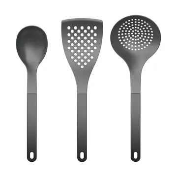 Optima kitchen utensils 2 3 pieces from Rosti is a set of three utensils made of durable nylon, making them gentle on coated frying pans and saucepans. The set includes a serving spoon, a perforated large palette, and a large slotted spoon. The utensils withstand temperatures up to 220°C, feature an ergonomic design with hanging holes, and are dishwasher safe, making them practical for daily use.