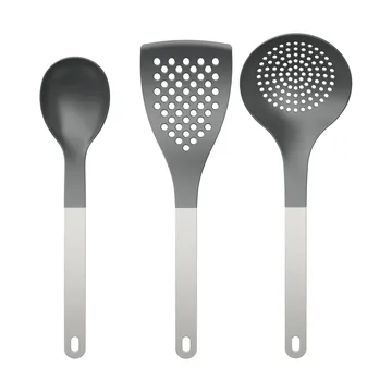 Optima kitchen utensils 2 3 pieces from Rosti is a set of three utensils made of durable nylon, making them gentle on coated frying pans and saucepans. The set includes a serving spoon, a perforated large palette, and a large slotted spoon. The utensils withstand temperatures up to 220°C, feature an ergonomic design with hanging holes, and are dishwasher safe, making them practical for daily use.