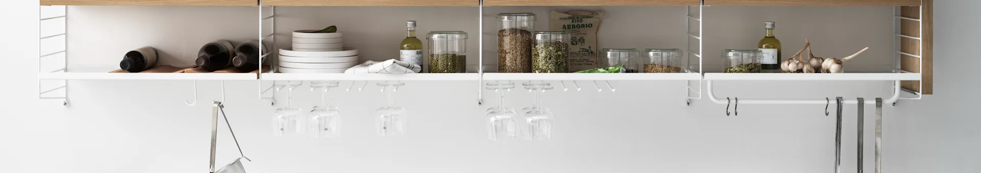 Discover practical and smart features for your kitchen storage with one or more String shelves. The String shelf allows you to combine your own custom-designed storage furniture for your kitchen. Here, you can choose drawers for storing items like napkins or towels. Cabinets enable you to store pantry items, and String display cabinets with glass doors offer beautiful storage for glasses and vases. With the String system in the kitchen, you can also create practical storage solutions that help you keep smaller kitchen utensils, like cutlery and knives, organized.