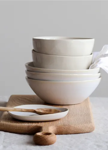 Vince bowl M from Tell Me More is a handmade bowl in white-glazed stoneware with a beautiful, glossy surface. The versatile shape makes it perfect as a breakfast bowl, soup bowl or for serving sides and small dishes. Each bowl is unique in color, shape and feel, giving your table setting a lively and personal expression. Use it alone for a simple, authentic feel or combine it with other stoneware collections for an inviting and varied table presentation.