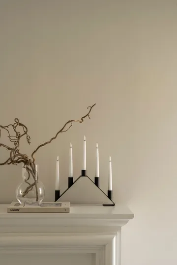 Luna advent candle from Watt & Veke is a metal advent candle holder with a modern design. Five battery-operated wax candles with realistic flames, which can be easily lit and extinguished with the included remote control, are included with the candle holder.