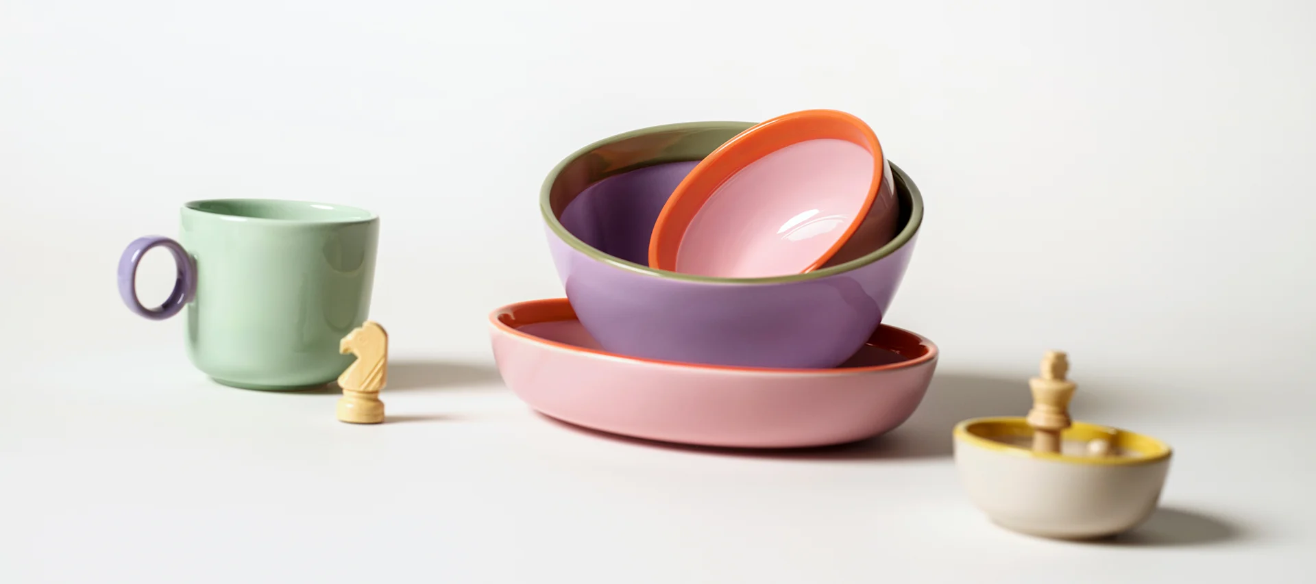 Play offers a collection that brings colour and playfulness to everyday moments. The energising pastel tones were inspired by Janni Vepsäläinen's trip to the south of France where she visited the Chapelle du Rosaire in Vence. The chapel, designed by Henri Matisse in the early 1950s, revealed details and thought-provoking elements that inspired Janni's creative vision.